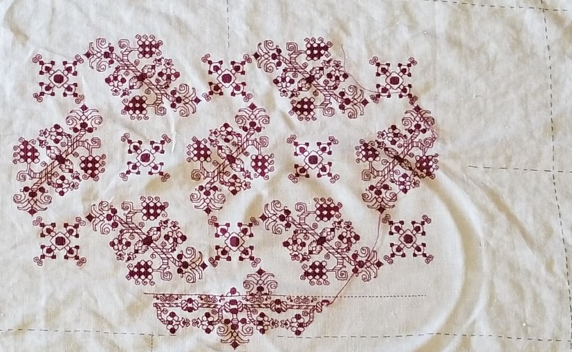 I played with the two main elements of this all-over repeat until I hit upon something that was regular and that accommodated the use of the smaller motif both as the “pinwheel” spinning off the larger grape/floral motif, and to occupy the center of the circle formed by the grape/florals. And I began stitching.
