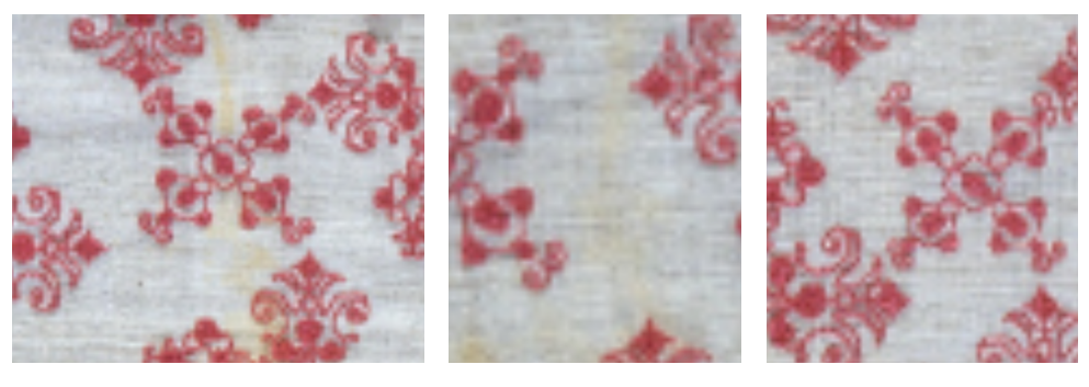 One big problem with my graphing of the design is that the original doesn’t stick to count on the placement of the individual large and small motifs. While each motif is worked true to count, their scattering across the piece is a series of eyeballed guesses, with no two offset by the same spacing. Here are a couple of enlarged snippets from the museum original that showcase the variance:
