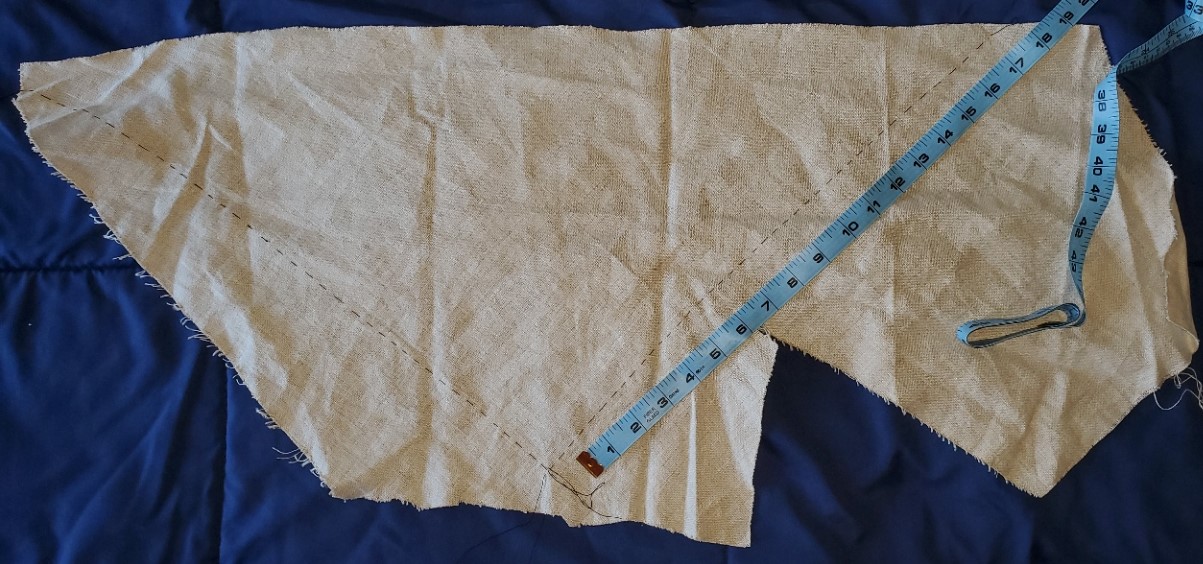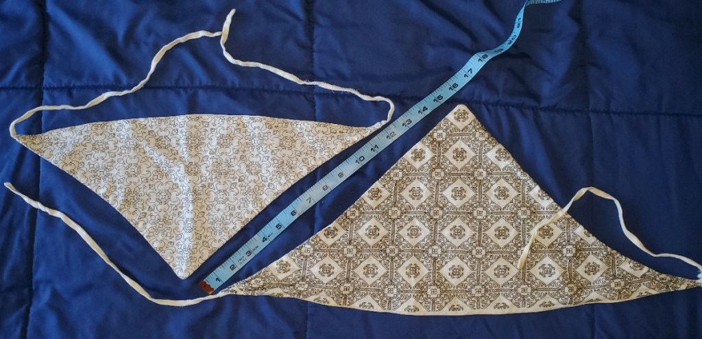 There is plenty of real estate on this piece of spill, left over from Anonymous Donor’s sewing project. I’m aiming to make something midway in size between the two forehead cloths I already have. Something in the range of 14 inches for the non-hypotenuse sides.