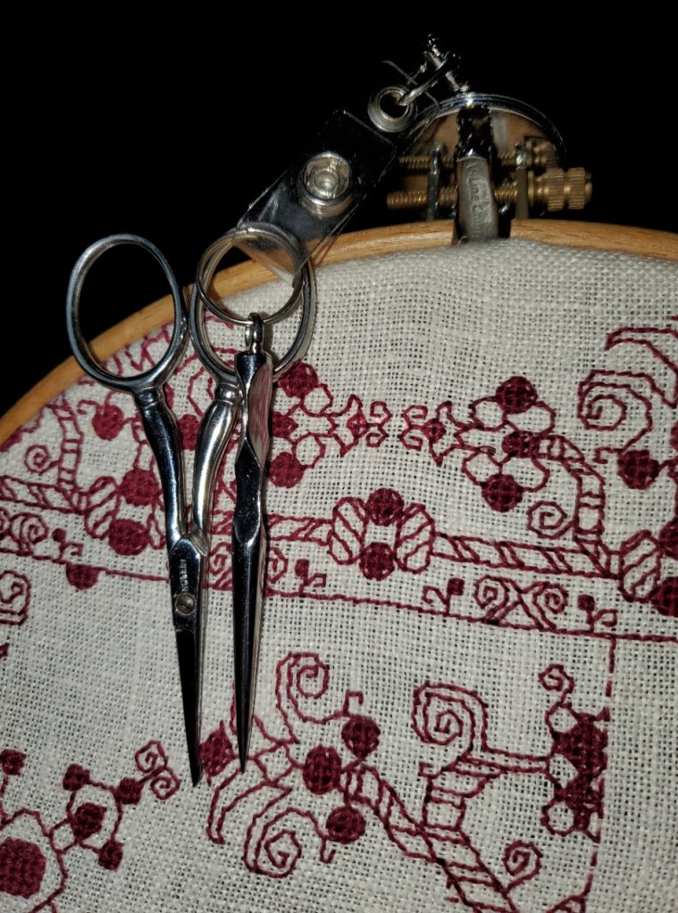 You can really see the even/uneven nature of the ancient linen in the shot above. Yes, I am working it in a hand-held hoop (although I’ll probably switch to my sit-upon later tonight). I’m using plain old DMC six-strand floss, color #615. This piece will become a placemat on my sideboard, where wines are generally opened. The grape motif is fitting, but there is ample chance for spills, and washability is my prime concern. The linen itself is already far from pristine, so a few more stains won’t make much difference, but I didn’t want to use silk or faux silk (rayon), to make care less complicated.