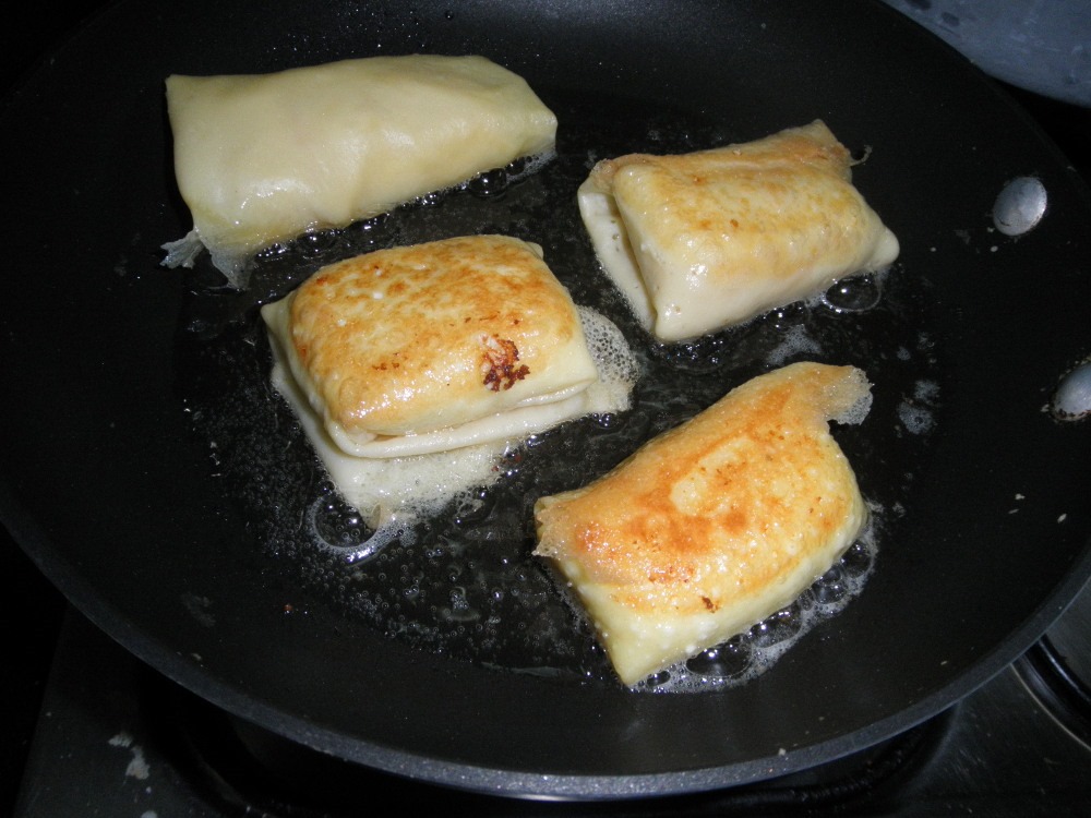 If you are looking for the recipe for the blintz skins/crepes and a more traditional mixed cheese filling, it’s here. Just to be evil and make you extra hungry, I leave you with what they look like during the final sautee: