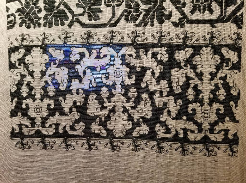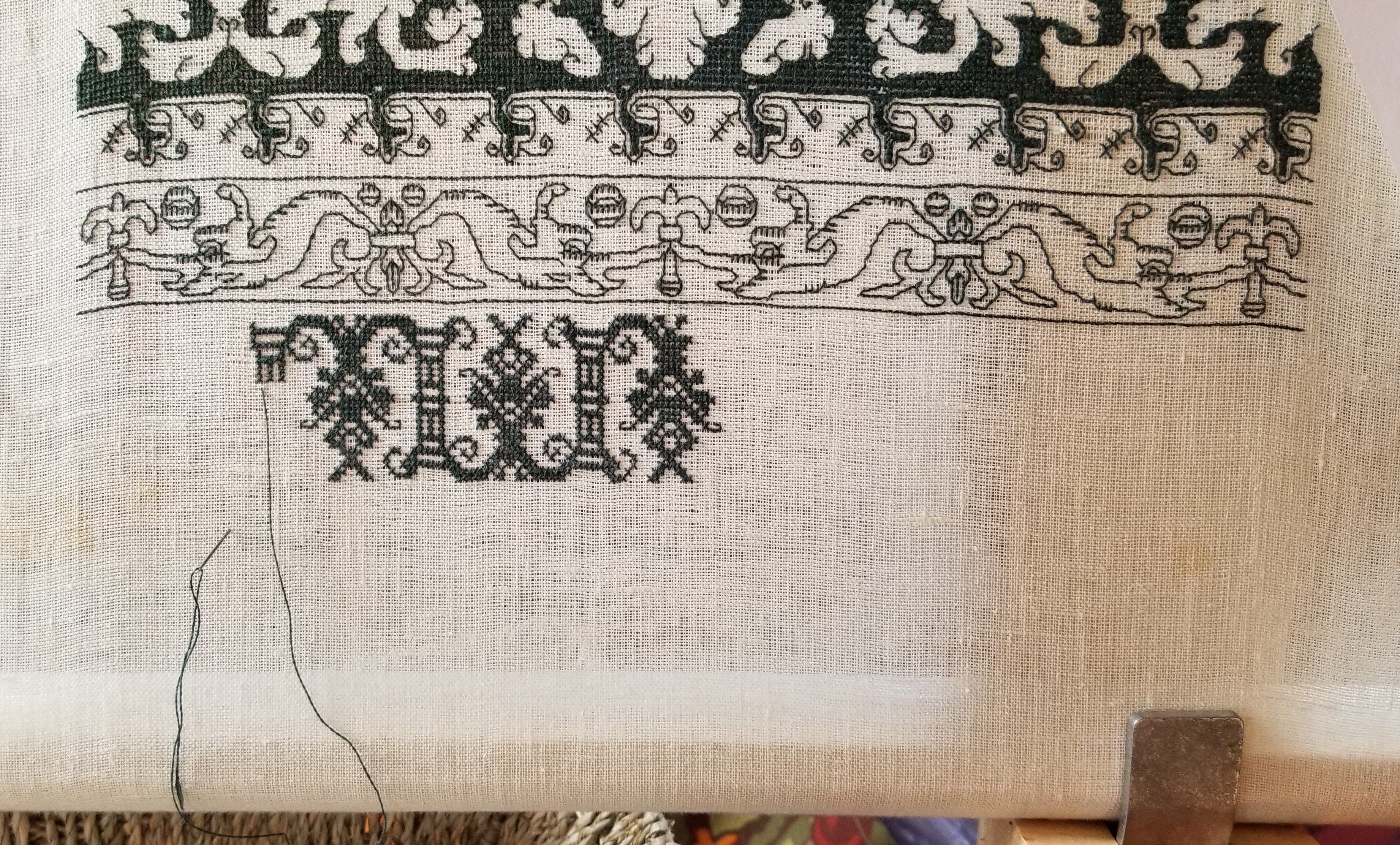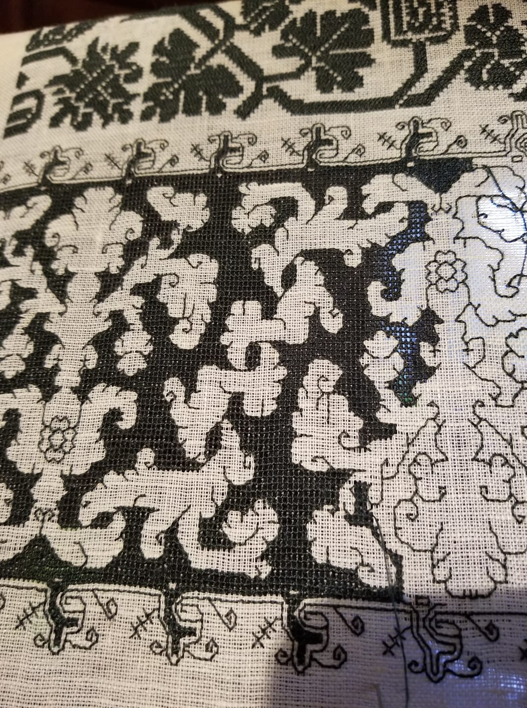 While my treatment of it in plain old cross stitch isn’t necessarily something that can be defended as a common historical usage, the use of these designs for both openwork (lacis or buratto, or even withdrawn thread designs) and surface embroidery on the count is well documented. Since I am not doing a historical piece I chose POCS because it on this ground with only one strand of silk, presented an airy and lighter contrast to the mesh technique, and the long-armed cross stitch and Montenegrin stitch that I’ve used in elsewhere on this piece.