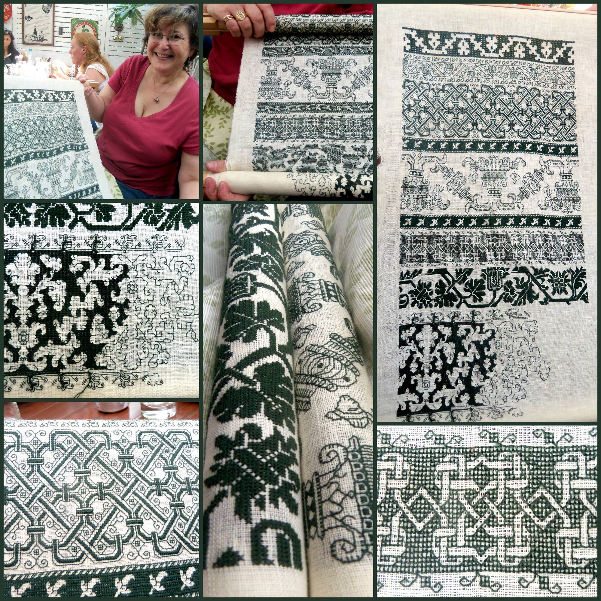 So into the stash for some ecru DMC linen floss (which I’ve now learned has been discontinued. It figures…) Because I’m stitching over 3×3 threads to even out inconsistencies in the weave, and because the linen thread is fuzzy with its own rustic character, I decided to play on that folksy appearance rather than going for crisp, tiny detail. The pattern is yet another one that will be featured in in TNCM2. This, when finished out, will be a strip decorating a pocket edge of a zippered stitching caddy. The entire outside of the case will also be worked in one of the larger all-over patterns in TNCM2. Without cutting up the dishtowel, I intend to origami it into a series of graduated pleats, then stitch perpendicular to the folds to make pockets opening “up” and “down”.