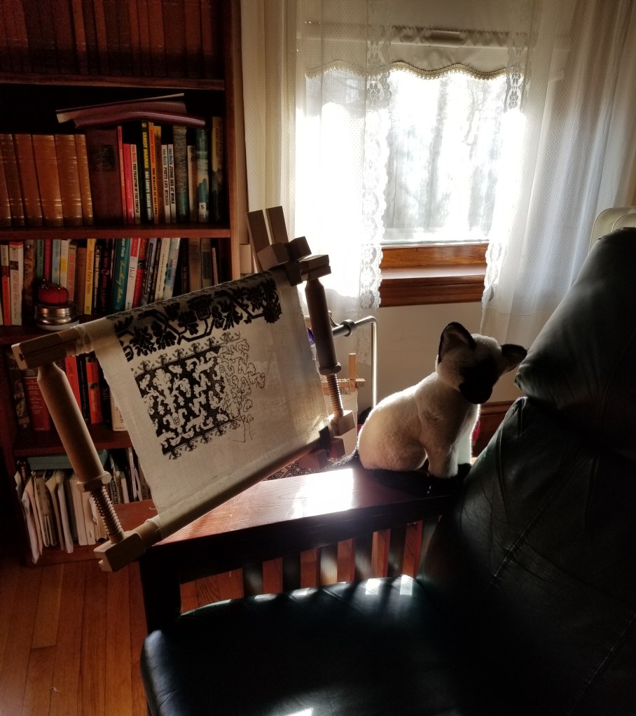 OK. What to finish with. I’m not sure. First I have to measure out my area to figure out the maximum height of what can be stitched there. Then depending on how tall that workable area is, there are several classic designs I’m considering. But a couple of them I have not yet drafted up (T3CM fodder?), so I may take a quick side journey into another simple piece while I’m thinking it over.