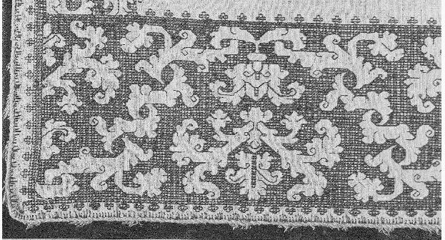 The museum description is rather cryptic. It says “Bobbin lace, buratto, punto a rammendo.” To me it looks like buratto – darning on a woven gauzy ground, and not bobbin lace or a withdrawn thread technique (punto a rammendo). Buratto and lacis are very close, with lacis being worked over a hand-knotted net mesh, and buratto being worked on a purpose-woven gauzy linen fabric. It’s structure is not unlike Penelope canvas, but made from much finer threads with much wider gaps between them. It’s effect is entirely that of an open mesh – no where near as dense as the Penelope. Admittedly this piece might be lacis. I am not seeing knots at the junctures of the meshes, but sharper photos might reveal their presence.