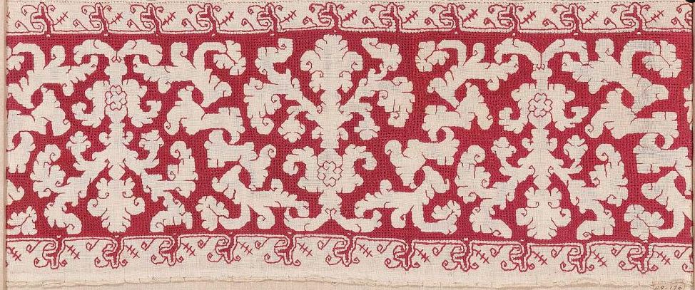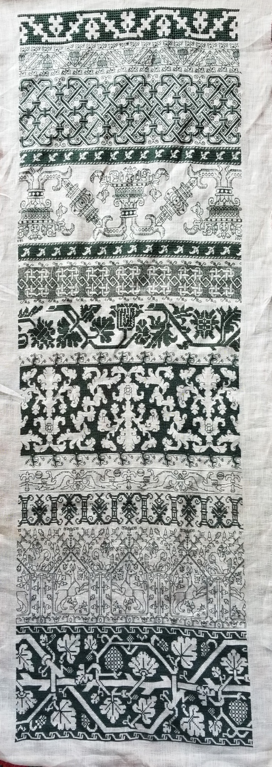 The museum citation says that the piece is from a chapel in Uppland, Östervåla; stitched in red silk on white linen. It also includes the matching vertical border which I haven’t graphed yet, plus a sweet row of heart-shaped cartouches bearing heraldry, the frames of which are also on my futures list. I haven’t stumbled across another piece of linear stitching in this style from this region/time, so it’s a bit of a mystery. How prevalent was it? Was this type of work limited to church linen? Did it appear also on clothing? Obviously more research is needed. If you know of any other pieces in this family, please let me know.