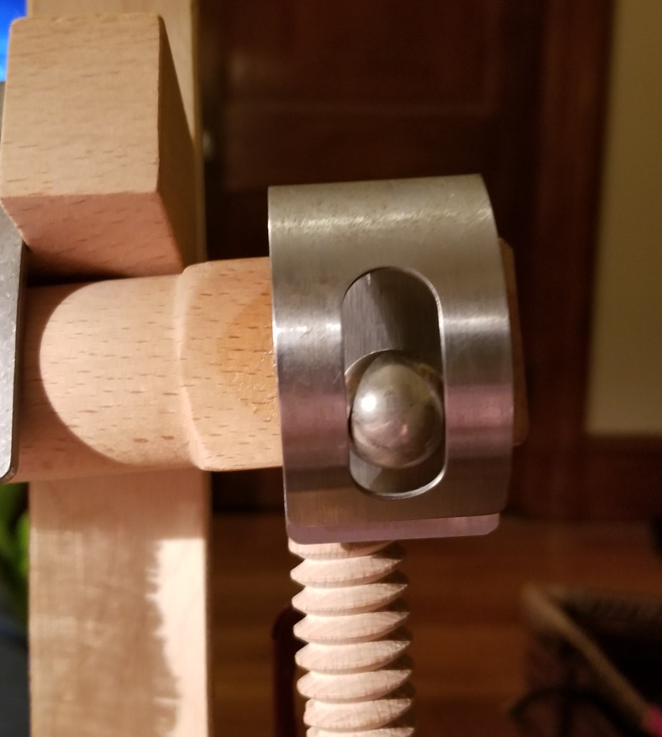 In the mean time, as I get up close and personal with the frame I am making little improvements to my set-up. For example, the jaw of the Lowery is steel, and well loved by magnets. But it’s not exactly accessible with the large frame extender unit. BUT when I flip the thing over to terminate a thread, it is. Add a strong classic U-shaped magnet, and I’ve got a handy place to park my snips (the red magnet is just behind the red snipper).