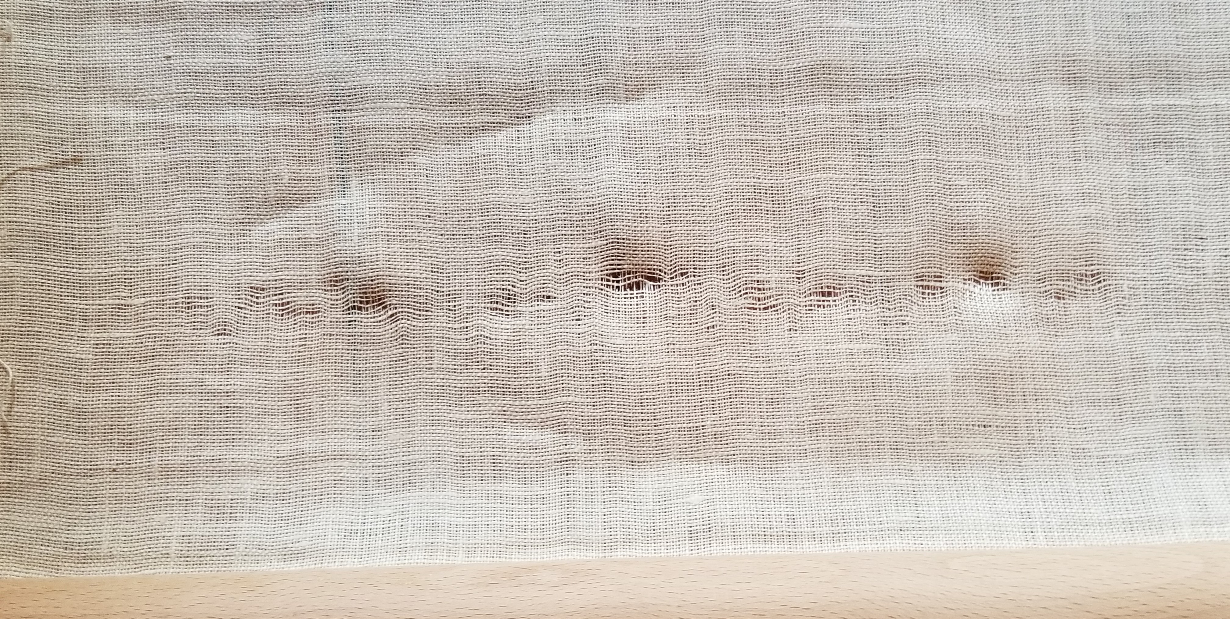 The aggregate result was that the area that had been rubbed and abused over time, and that had been fragile to begin with, under tension of my re-mount, began to give way. Note to self – no matter how tempting, avoid gossamer grounds and stick with more beefy linens…