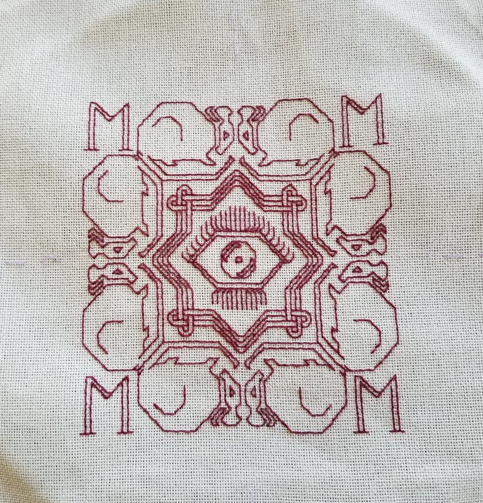 This piece was worked on DMC/Charles Craft Monaco, a cotton 28 count evenweave in a light tan, using two strands of DMC cotton embroidery floss, #814 – a browner red than I usually use. I haven’t cut the stitching from the greater piece of cloth, and I’ve left the easily withdrawn basting thread in place to aid in centering the piece on the eventual book cover. And since the stitching is in just one quadrant of the cloth, I will be sending it uncut, with the leftover thread in case Younger Offspring wants to do something original on the back, or on the other half of the ground, following the household precept that it’s always fun to encourage and abet creative expression