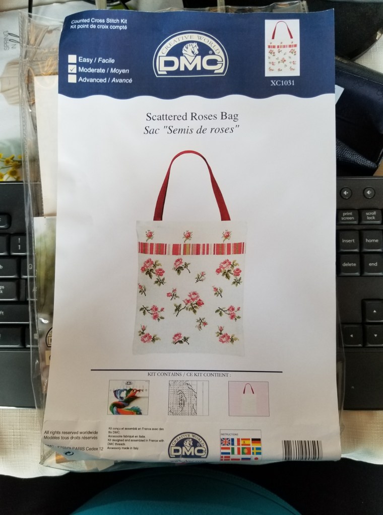 A couple of weeks ago I ran into a small DMC tote bag kit on our town’s freecycle/reuse/give-away exchange. I snatched it up. Although I didn’t want to stitch the rather boring roses intended, the kit with its big-as-logs 32 threads-per-inch evenweave was perfect for other counted work.
