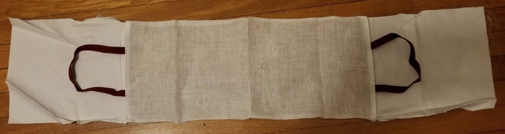 I basted guide lines at the longitudinal center of the bag, and a half inch all the way around the edges. The total stitching area is two sides, each about 8.75 x 10 inches (21.6 x 25.4 cm). I am unsure if I will work just one design on this, front and back; or if I will do something different on each side. But the intent is to stitch, then use a decorative seam stitch on the visible parts, and a less fancy treatment on the heavier white twill lining, which won’t be very visible after the whole bag is put back to rights.