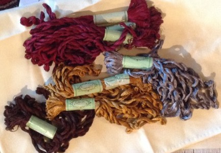 The wound bobbin in the middle is what I’ve been using (with a caveat). It’s Cifonda Art Silk color number 145. So is the hank on the left. The hank on the right is color number 144. It’s in the same continuum, but a click lighter. At the bottom is flaming cherry red 530, not even close.