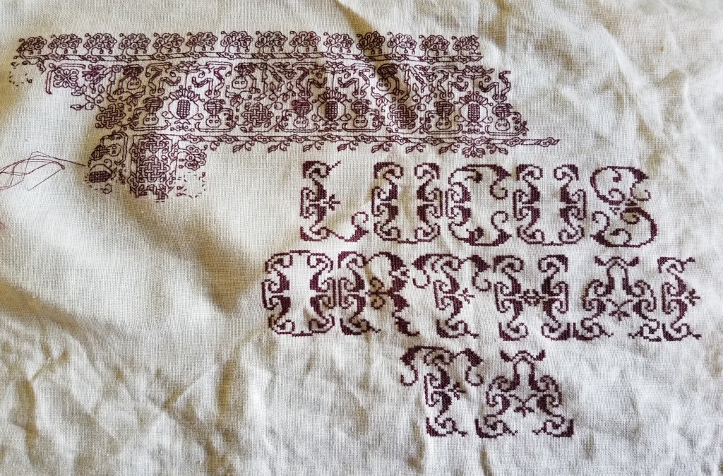 I am not sure where I got the alphabet for the “Do not meddle in the affairs of wizards” piece. I stitched it circa 1994/1995, just before I began keeping a blog. Obviously the source followed the additional classical convention of presenting just a V shape to cover both that letter and U. I’m also pretty sure I extrapolated the I. In any case, the thread count on this one is no where near as fine as on the others above. There was less room for larger lettering, and I had to find something small enough to fit (most of) the words in, with minimal truncation.