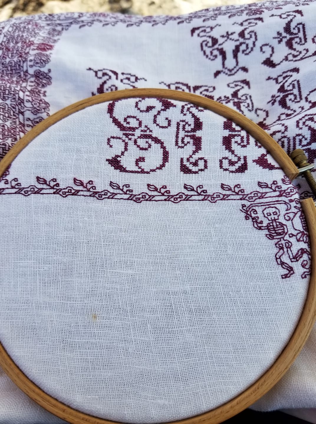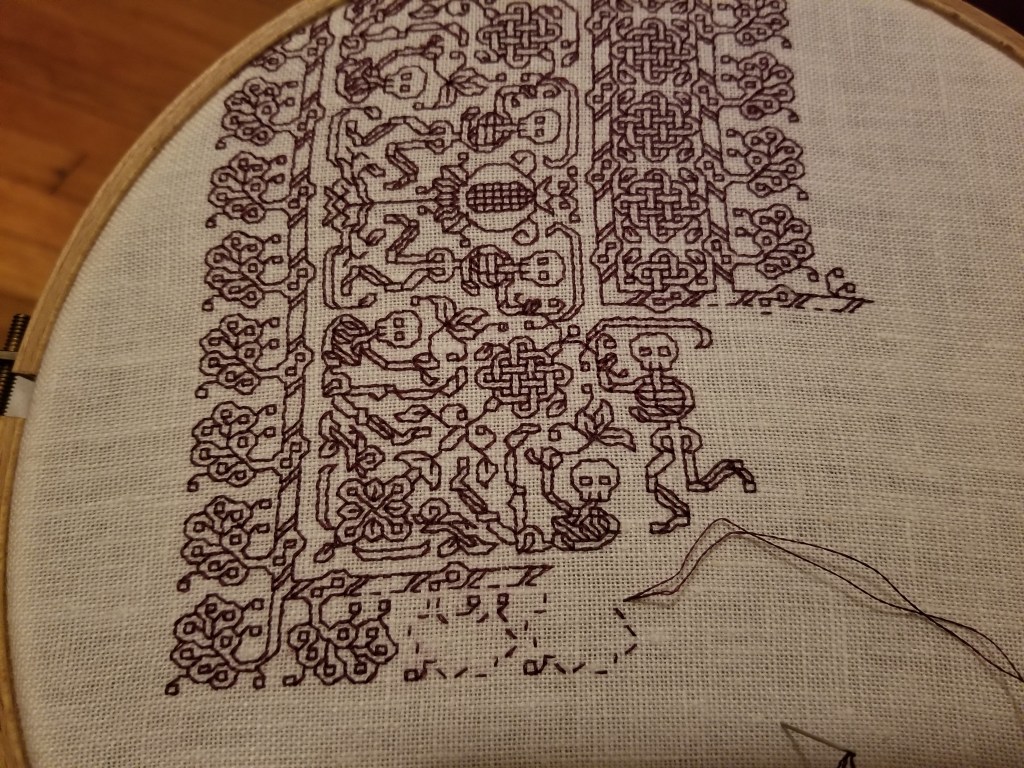 Of course, now I may go in and add something on either side of “TA” just to balance out the design. Still thinking on that, but in any case, the finish line is palpably near. Here’s the proof of alignment “tendril” – the inner border along the top edge fits perfectly, mating with the work I laid down at the very start of my journey around the edge (the bony boi and the border above his head, at the hoop’s right edge).