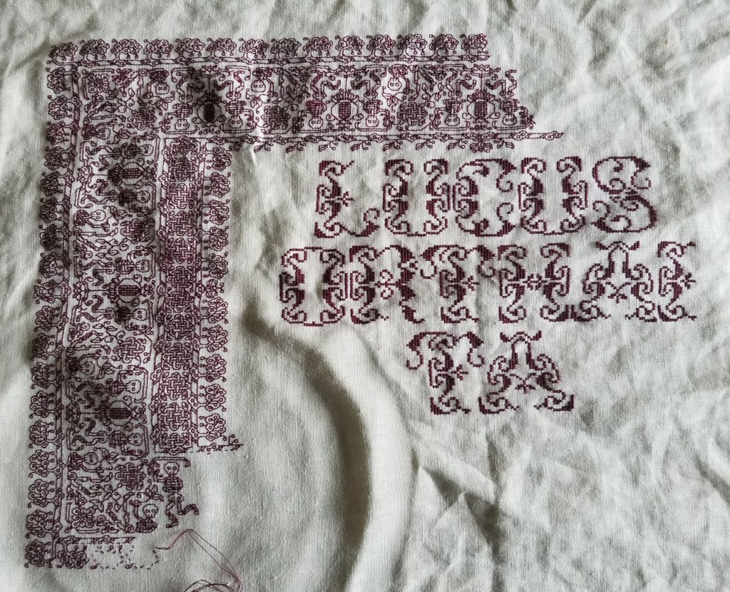 For the most part I almost never work on fully charted out projects, with every stitch of the piece carefully plotted in beforehand. I compose my own pieces rather than working kits or charts done by others, and as a result I never have a full every-stitch representation as my model. My working method is to define center lines (and sometimes edge boundaries), but I pick strips or fills on the fly, starting them from my established centers, and working from smaller charts that are specific to the particular motif or fill that’s on deck. However, if lettering is involved I am more likely to graph that part out to completion prior to stitching, to ensure good letter and line spacing. (Leading, spacing, and kerning are close to my heart both as someone whose day job deals in documents, and as a printer’s granddaughter.)