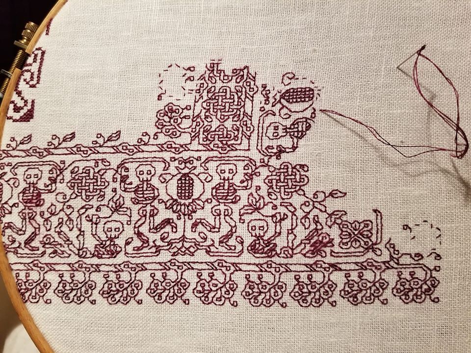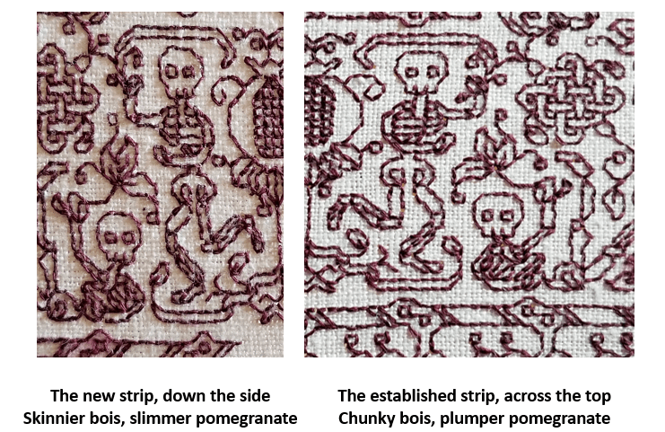 But why did I start with the strip of skeletons doomed to dance upside down? Because I knew that I would probably make some tiny adjustments to the design as I went along. The viewer’s eye is drawn to the closest point of the work, and the most logical part – that’s always the strip across the bottom, where the motifs are all right-side-up.