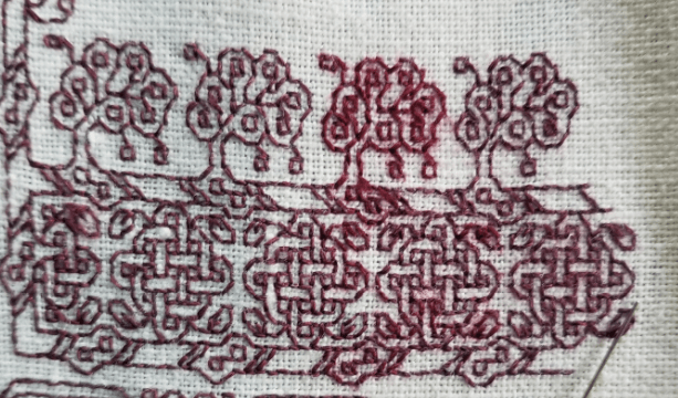 - Is my new bit in the right place? Does the placement of the design element align with what’s been stitched before? For example, in this case, is do the toes of the mirror imaged bois back to back to the pomegranates match in placement in relation to each other and to the bottom of the pomegranate’s leaves?