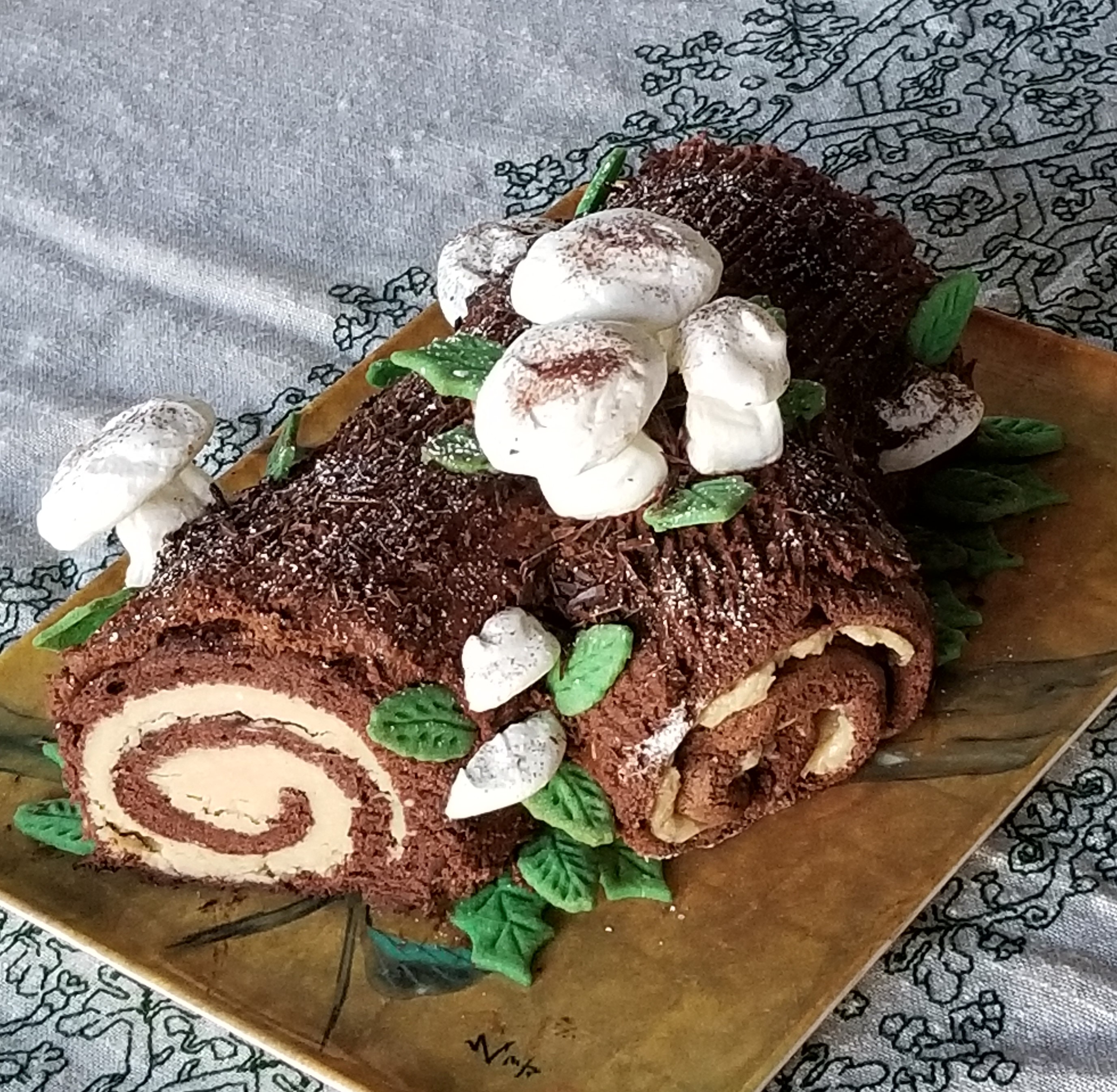 But that’s only the start. Younger Spawn also made a magnificent Buche de Noel (Yule Log Cake), with chocolate buttercream outside, and hazelnut buttercream rolled in a rich cocoa genoise. Including the traditional meringue mushrooms and little leaf-shaped sugar cookie leaves.