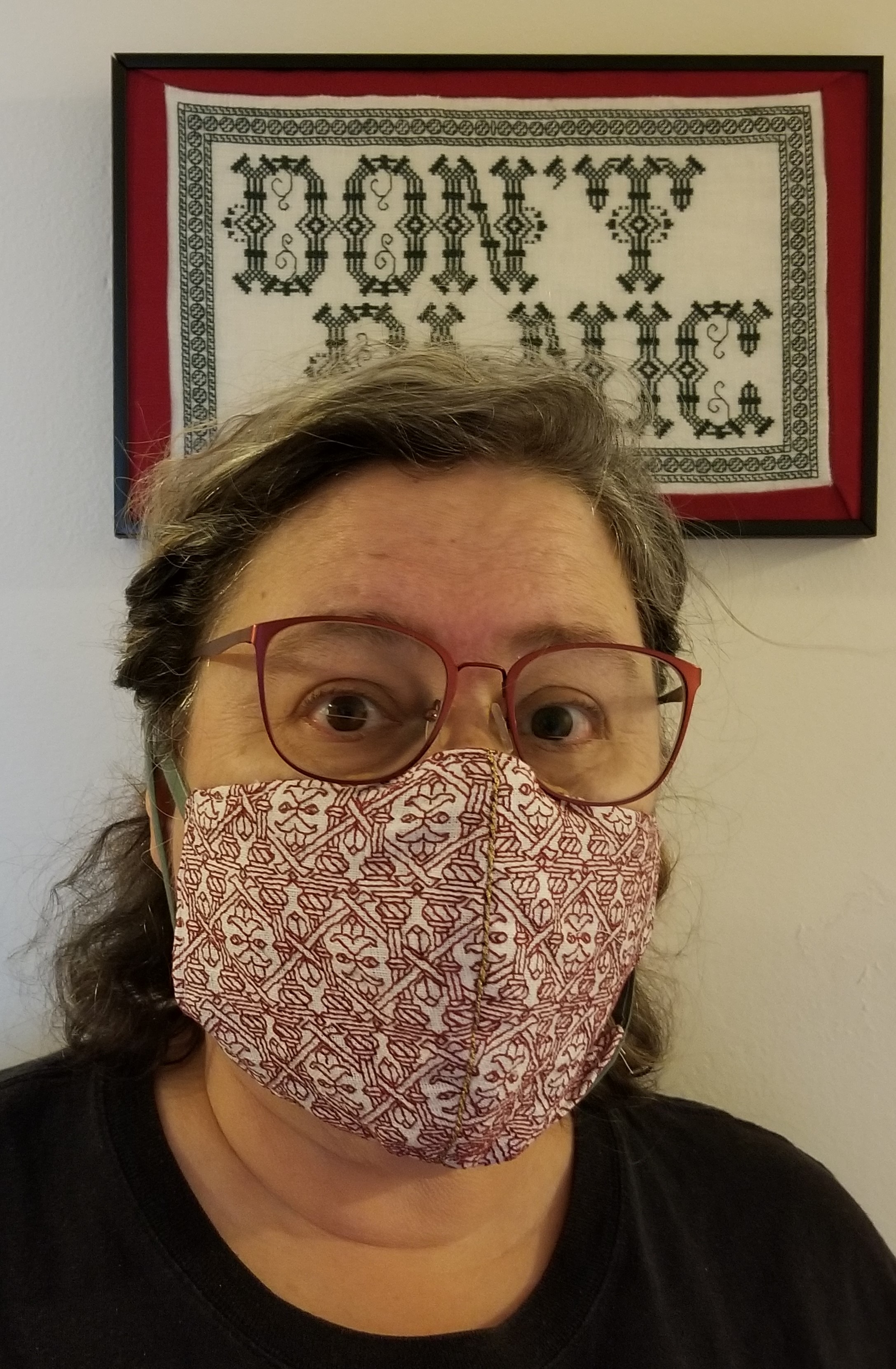 The Covid sentiment, done in a blackletter typeface, uses two alphabets from a German book, available on Patternmaker Charts. One is uppercase, the other lower. The lower case alphabet also supplied the numbers. Again I had to invent a matching letter I. Blackletter family typefaces are reserved for formal documents like diplomas, and newspaper mastheads here in the US. I wanted to play on that gravitas.