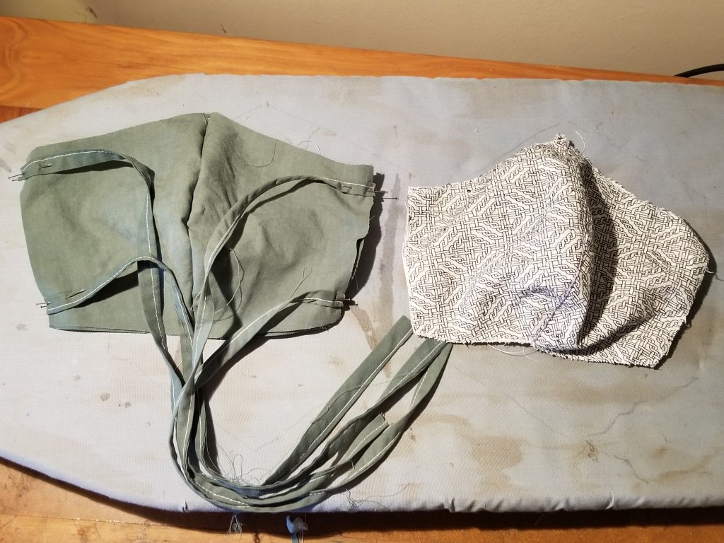 Then I cut the actual protective layers, traced from the same template I used to lay out the stitching, plus the lengths for the ties (I favor ties over elastic). Each mask has two layers of high thread count percale (harvested from retired sheets and pillowcases) in addition to the decorative outer layer.