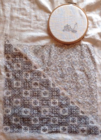 The idle moments bit that’s taking place on the ground cloth area NOT used up by my two forehead cloths has taken on a life of its own. Frankly, it started out as a delaying tactic – stitching was too much fun to stop and tend to finishing the two now-completed kerchiefs. But it has become more than that.
