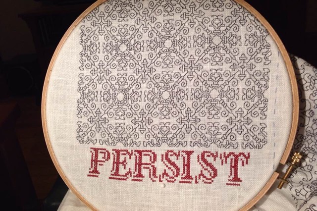 I liked the visual balance of this one better. While I lost some of the light/dark checkerboard effect of the original, I gained an interesting play of curves and frames. Considering that this pattern conforms to the 45-deg/90-deg/180-deg composition rule found in just about every historical piece of linear stitch count-work (“Knight’s Move” two-over-one up stitches are exceedingly rare), seeing curves at all is almost an optical illusion.