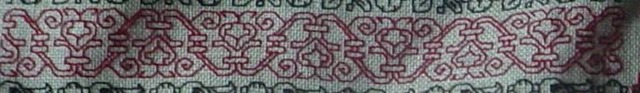 After this comes another narrow strip pattern across the top (I can’t abide wasted space); plus a narrow border to frame the entire area. The border and possibly the narrow top strip will be done with thread from a second batch of black silk, also hand-dyed with a historically appropriate dye by my Stealth Apprentice. The goal is for me to “beta test” her output, and report back on the stitching qualities of each of the slightly different recipes.