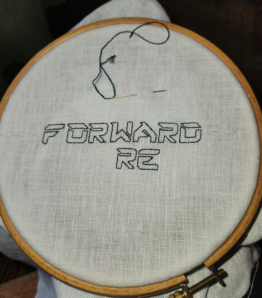 The first step is to begin the design of the motto. In this case “RELENTLESS FORWARD PROGRESS,” furnished by the Vanderbilt Physical Therapy team. Done. And then to begin thinking about how the rest of the piece will be worked. Not a band sampler this time, it will be a “framed” piece, with one or more bands of design running around all four sides of the motto, complete with corners and any improvisations to make the bands’ designs work out correctly with minimal fudging. Therefore I will be doing a some on-screen work to prepare for this one. More than I would have needed had this been a simple band sampler. For example, those corners will have to be drafted out even if I chose band designs I’ve previously devised. And I will have to plan to use multiple colors effectively because while there are many hues in my bag of silks, there are no duplicates, and most of the skeins are partials. It will be fun to figure out how best to use my limited quantity treasures.