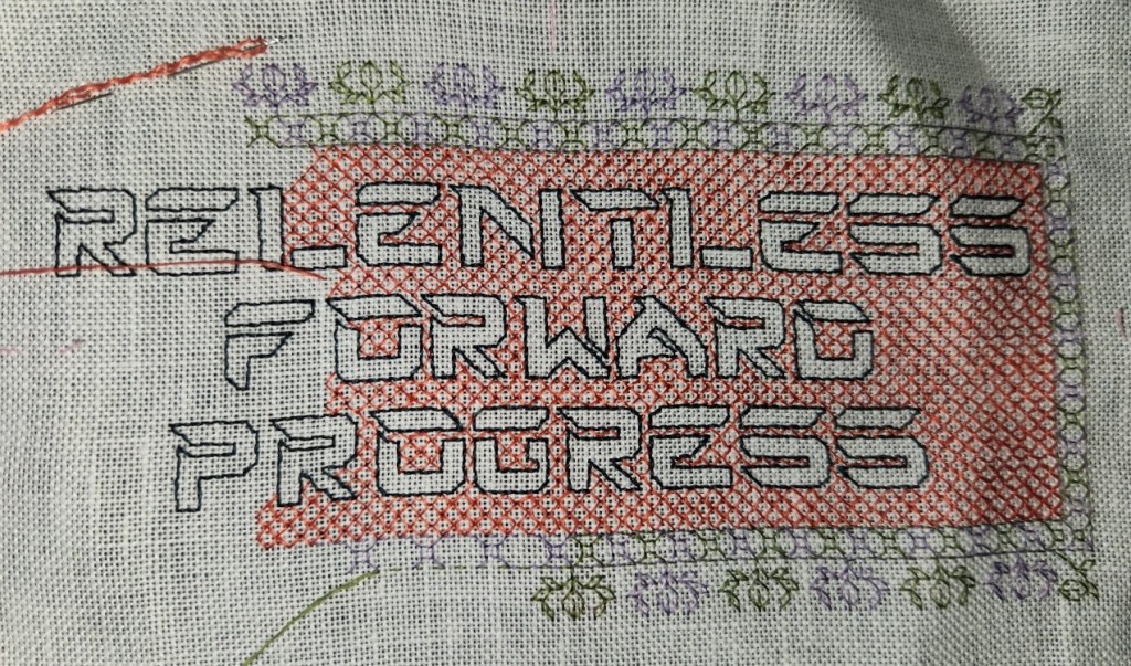 As I mentioned in the last post, I was prepping the ground for RELENTLESS FORWARD PROGRESS, the piece I am doing as a thank-you for the therapy and nursing staff at Vanderbilt Rehab/Newport Hospital. I’ve finished the truing, decided on a size, hemmed all the way around, and basted my centers and edge borders. I also completed the atypical (for me) task of plotting out 90% of the chart for the entire piece, and started in on the stitching: