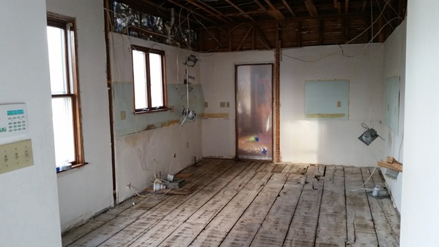 As I reported on FaceBook, those remaining walls and ceiling bits had to go. The previous homeowner, in a typical fit of doing things in the cheapest, and most stupid way, used a low grade of plain old wallboard underneath the skim coat plaster when he ripped out the original lath and plaster during his redo of the room in the early ‘80s. That means that they were not salvageable. We had not planned on taking down the parts that were not going to be modded, but we were forced to because the walls were crumbling. Oh well… There’s no such thing as a renovation of a vintage house that does not involve an Unexpected Surprise.