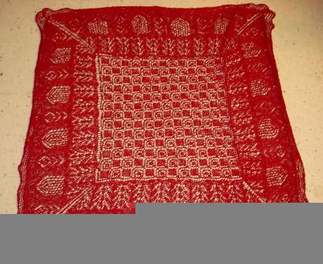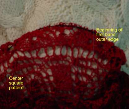 I’ve finished the center square of Alcazar, and have successfully picked up the requisite number of stitches around its perimeter. This was relatively painless as picking up sessions go because of the highly sane way in which the pick-ups were structured. If you go back to Friday’s picture, you’ll see that there are mesh-like spaces along all four edges. The directions say to achieve the correct number, all you have to do is pick up one stitch in the first mesh, do a YO, pick up a stitch in the next mesh, do a YO, and so on. And it worked! I managed to get the correct number on the first pass on each side.