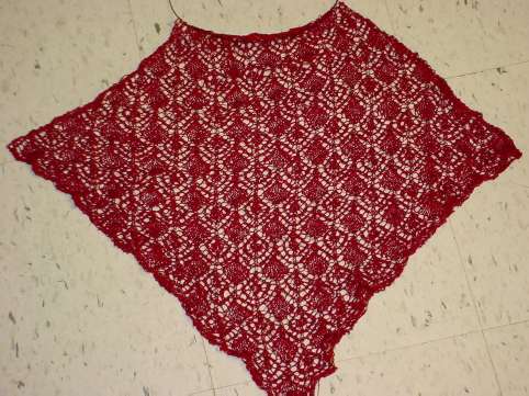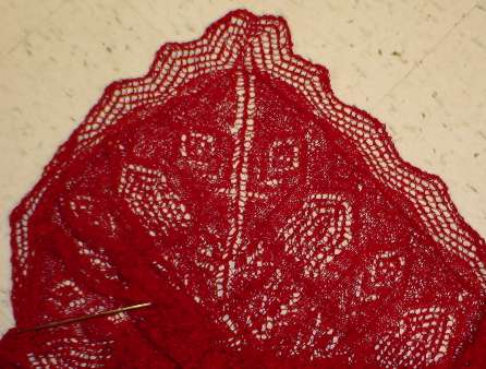 At long last, here it is. My Alcazar, knit in red faux-silk rayon – blocking out on my makeshift blocking board, all thanks to the Columbus Day holiday.