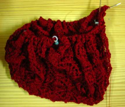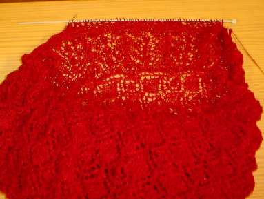 I took the time this morning to slip some stitches onto an extra needle so you can see more progress than the usual red lump photo would show.
