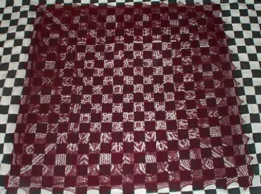 What I’ve got here is a kids’ area rug, topped by some bath towels with a checkerboard flat sheet thrown on top. Over that goes the shawl, pinned out by the points. The checks are nice, even 2" (5cm) squares, and make keeping things even much easier.