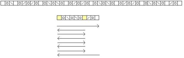 The picture below shows a single pattern row (of my own invention, not taken from Alcazar). You can see it has edge stitches plus several iterations of the main pattern. I could have graphed it up to show one full iteration of that center pattern, plus the edge stitches. That’s pretty condensed compared to the original. But it takes even less space to show it in pivot format – the tiny row below the long one.