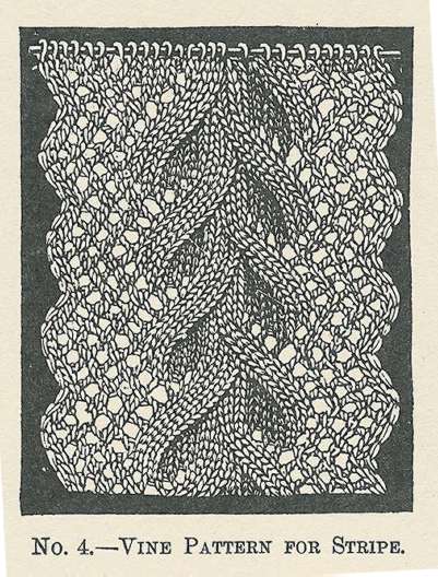 Instead I toyed with an antique pattern from Knitting Essentials: Knitters Historical Pattern Series Volume One. This is a reproduction edition of Butterick’s Art of Knitting, published in 1892. The editor for the repro edition is Melissa Johnson. Amazon’s on-line peek inside feature gives a good representation of the book’s contents. The particular pattern I was noodling with is on page 19. It’s called “Vine Pattern for Stripe.” In the book it’s described as “pretty knitted in cotton or wool…and may be used as an insertion or as a stripe for spreads, afghans, etc.” I’ve seen some similar things in other pattern books, most notably the zig-zag edges, but not in this exact combo, with the edging done on both sides of a faux cable.