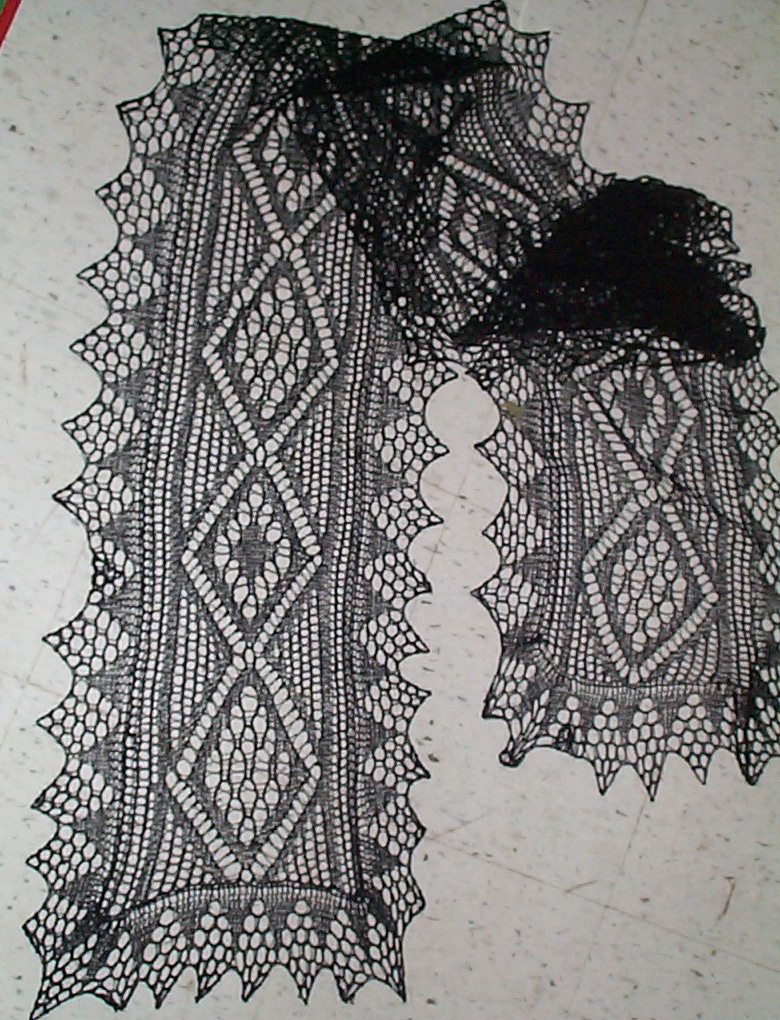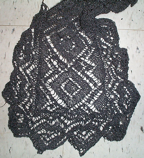 I also played with the main diamond motif – alternating ones with the full pierced centers with ones that filled in the center-most four diamonds. I chose the edging because the structure replicated the mesh in the pierced diamonds. I also took the lazy way out on the corners. Rather than calculate the miter, I just went around the edges, doubling up on my rate of attachment to make enough fullness to ease around the 90-degree angle. Elder Daughter has poached this one for her very own. But (to quote someone I ran into in the airport while I was working on this last week). “You’re a sneaky parent. How much of a Goth air can it provide when the wearer has to ‘fess up that “My mom knit it for me” whenever she’s asked?”