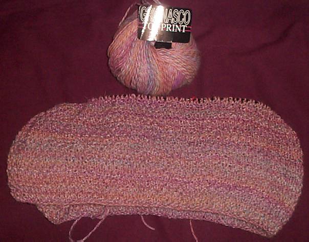First, on specific request, I’ve begun Knitty’s Kyoto for Elder Daughter. But I’m working it in a DK weight tweeded alpaca. I’m using Grignasco Top Print in color #29974 – a ragg type mix of soft antique pink, pale turquoise, lavender, apricot, pale brown, ecru, and sea green. The “distance read” on it is sort of fallen cherry blossom, somewhat pink/lavender with a touch of pale brown, with the natural streaks imparted by the ever changing tweed.