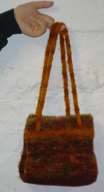 In total I think there’s about skein and a third of the brown/paprika Canyon color, a third of a ball of dark brown (the bottom of the bag, plus the first three or so rows of the tube); and a third of a skein of gold (the stripe and the handles). It’s hard to give exact totals though as all was in little balls and I didn’t bother to weigh it first. We fulled?the bag?in the washing machine by tossing into two hot wash/cold rinse loads of dark colored towels.