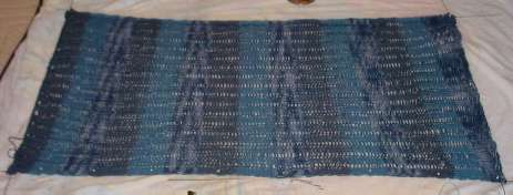 The unplying continues. And continues… I can report progress though. I’ve almost got enough to begin swatching, and the Target Daughter has picked out a couple of stitch patterns that she likes from other things I’ve knit and from my library. Leading candidates include "Lace Ribbon Stitch" from Walker II (p. 284); K3, P3 rib; and a mock cable. Both are true lace stitches in that they have YOs, and decreases on every row, with no intervening plain rows. I’ve also got three colors of blue to play with. I’m thinking of running them side-by-side Intarsia style, withthe colors corresponding to the lace orribbing panels used. It may be just another poncho, but who says knitting it has to be boring.