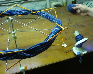 O.K. Now when I’ve finished, I’ll have a neat machine-wound little core sample of two-ply yarn, plus a hand-wound ball of one-ply. How to turn the one-ply back into a two-ply?? Simple. I repeat the paring down process on the other skein of yarn, then I place both skeins on the floor or in a box (I’ve heard that cutting the bottom of soda bottles and threading the strand through the neck works wonders). Then I use my ball winder to draw on both at the same time. Minor complication – the variegated won’t match up in color across both plies. I’ll just treat it as another color of variegated, and isolate it in its own stripes or other pattern segment.