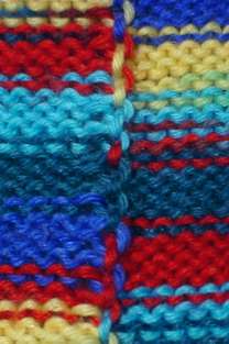 At the very least, this continues yesterday’s visual lesson on using variegated yarns. The narrower the span of stitches covered, the wider the stripes will end up being. How to know if your yarn will stripe or make that stippled effect? Look at the length of each color section. The longer it is, the more likely it will be to stripe. How to estimate on the fly? In general, a row consumes roughly 3 to 4 times its length in yarn. That’s a very rough estimate. If the color sections are at least three times the width of your piece to be knit you’ll end up with a one-row stripe. That stripe might not begin at the commencement of each row, and may end up being a wider puddled “bounce-back” section on a side, but it will take at least that much length of any one color to have any hope of visual striping.