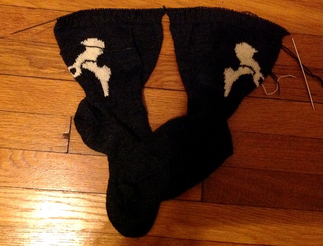 Even on the project end, I haven’t had time for as much as I planned. Between working from home part time and the rest of the laundry list, above, plus standard household stuff like shoveling, I didn’t get a chance to sew the the new curtains for the library that I had planned as my end-of-year break effort. I’ve also set aside the Mixed Wave Cowl for Elder Daughter, and didn’t get started on some other holiday knitting or needlework. Those things were derailed by a request from TRM to knit up a pair of socks as a post-surgical gift. So I am now trying to motor through a pair in very boring grey fingering weight. They will be enlivened by a design on the ankle – probably something skeletal and hip-like, worked in Intarsia. Here you see them, with the feet and half of the heel complete, almost up to the motif area; two rather dull, shapeless grey blobs.