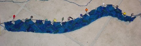 Although the texture of the yarn is interesting, it’s the color that captured me. Color sections are medium sized- about 6 to 10 inches, and the colors are especially intense. Using this over long rows would mull the colors together because each would last for an inch or so over one row and then change. While the result would be pleasing, it’s not what I want to do. I also don’t want to do a big flash piece because the color sections aren’tlong enough to do that easily. I want puddles of these blues, and to achieve a moreMonet’spond lookthana Jackson Pollok effect.