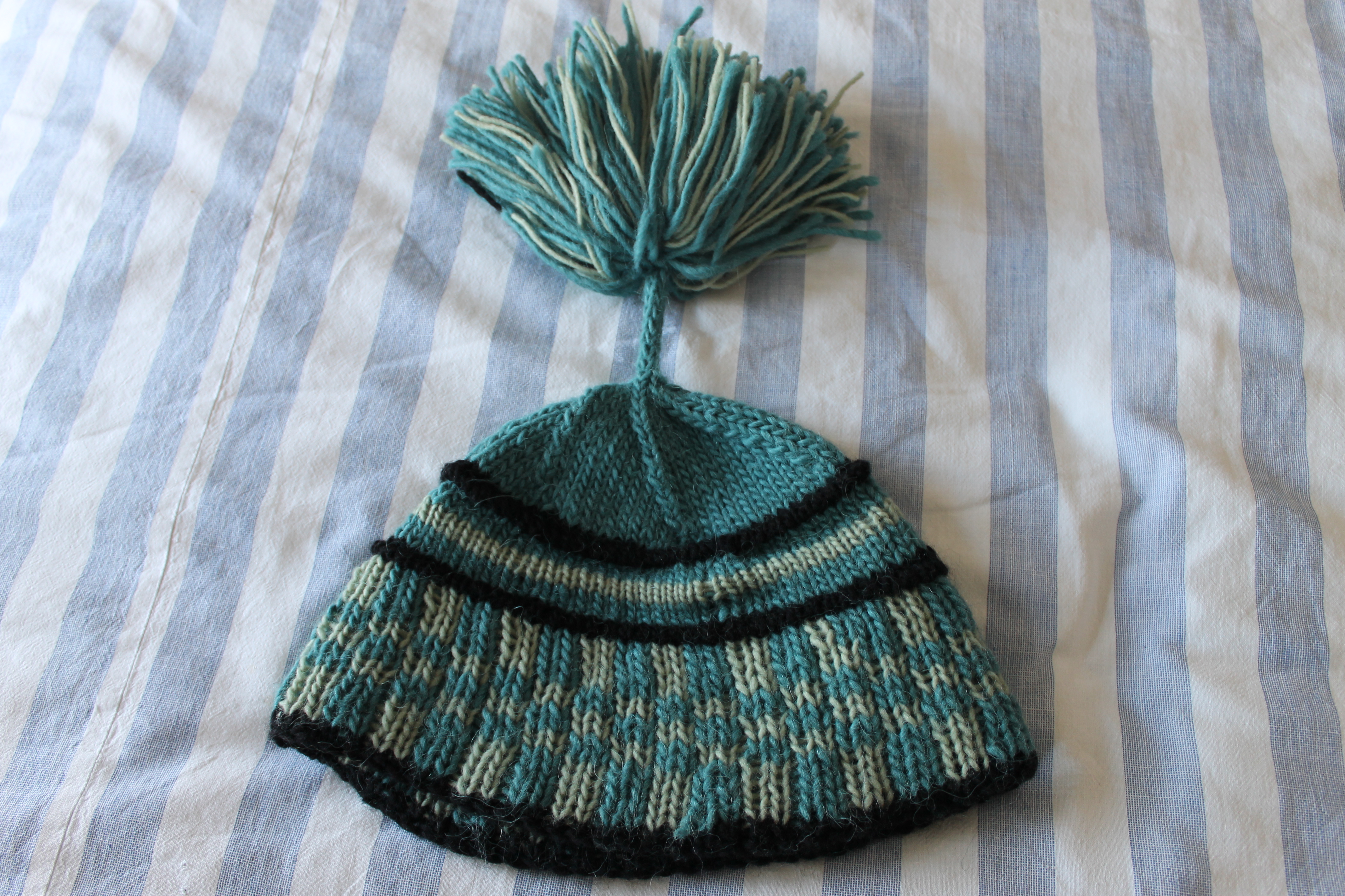 My other change was the treatment of the ribbing. The pattern original advocates using the same variegated yarn as the body. Instead I chose solid black, as a framing element.