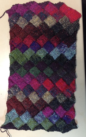 And on to more knitting. I’m currently working on an Entrelac tunic pullover, from a commercial pattern by Sarah James. This is the second pattern I’ve done by that designer, the first being her Autumn Leaf pullover. I’m using Noro Taiyo yarn, an Aran weight variegated made in Japan, that has a very improvised and rustic Raku-ware look to it. The yarn I’ve chosen is slightly heavier than the heavy worsted/Aran weight yarn specified, although they have the same native gauge. This is not turning out to be a problem for me because I want my finished product to be slightly larger than the larger of the two provided sizes.