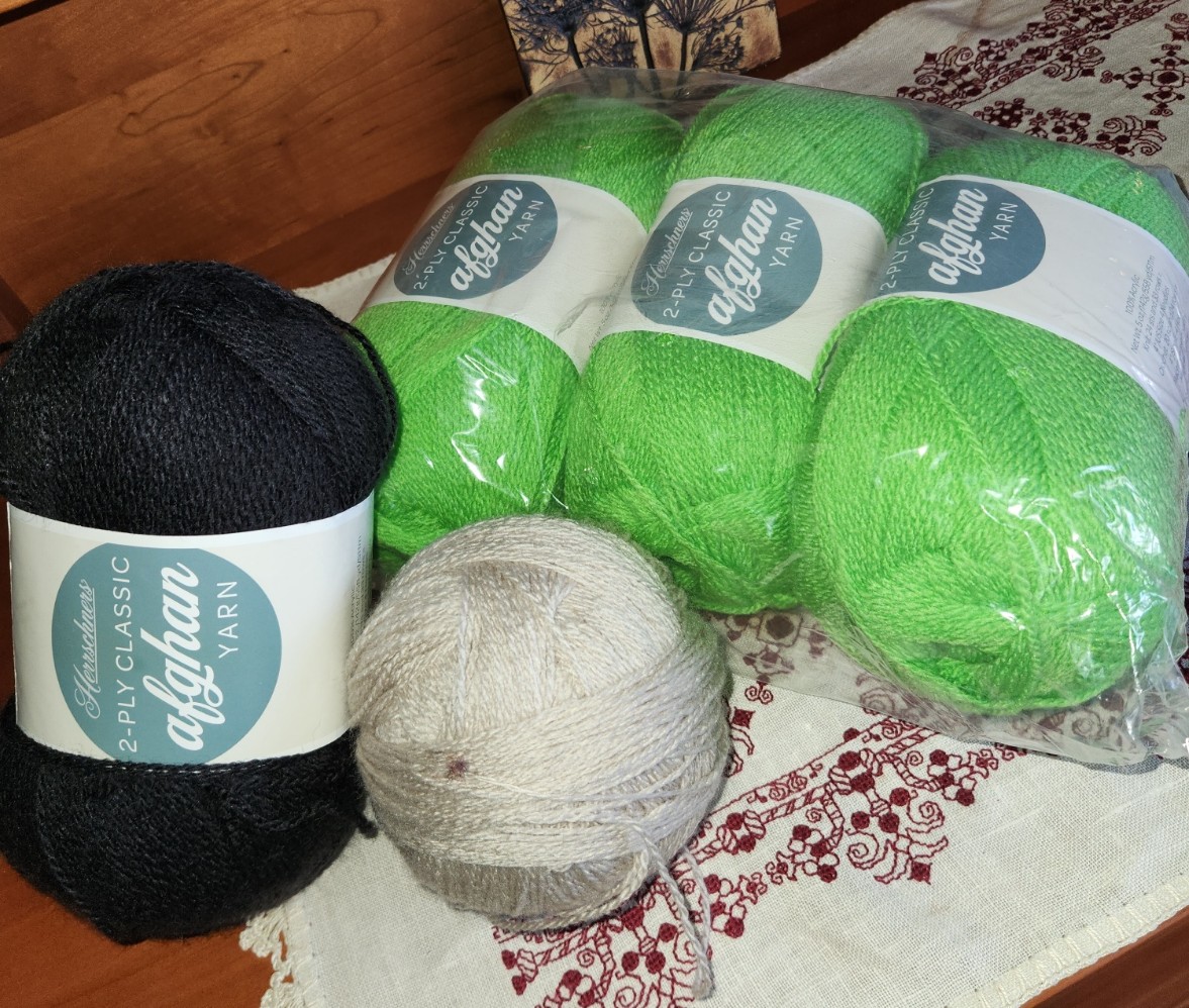 I’m using leftovers from the bolster cover I did two years ago. The shocking green, the oatmeal white, and black, to be specific. It’s acrylic, and sport weight (24 stitches = 4 inches or 10 cm in stockinette) from Herschnerr’s. As you can see, I’ve got plenty.