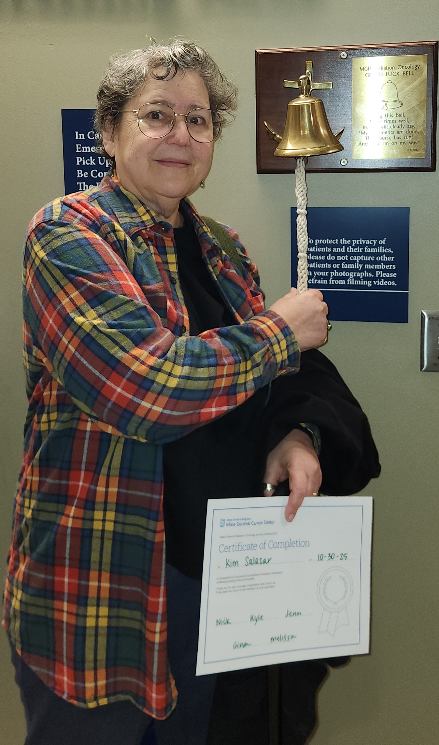 Special thanks to the radiation crew Mass General Hospital, who greeted me every morning with good humor, efficiency, and a steady tolerance for my unorthodox music requests. I suspect that at least one of them has signed on to read here at String because of a mutual interest in knitting. If so, please pass the word back to the whole gang.