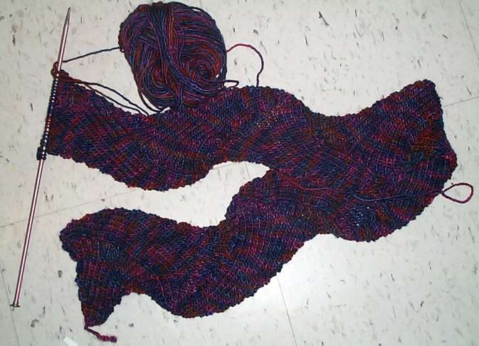 The second is a product of the need to do mindless knitting. I started another Snake Scarf, knit from an extravagance – Schaefer Yarn’s Helene. This yarn is next-to-skin soft, with all the luster of silk. It is however an Aran weight/light bulky weight single, and like all singles spun from soft yarns, has a tendency to split. I suspect that it will also catch a bit. But it’s lovely stuff, and giving the scarf away will be difficult to do. I can’t identify the exact Schaefer color combo my Helene is (I bought it over a year ago and lost the tag), but it’s mostly navy and raspberry, with hints of brown. The color repeat is however quite short, and does not produce the eye popping striped effect of longer color run yarns. (I’ll be posting a yarn review of the stuff soon).