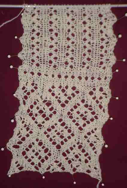 I drafted up my patterns, and swatched each one. Here’s where the mistake came in. I’ve got**just enough**yarn with no chance of getting more, so I swatched each pattern in turn by itself, ripping back and re-using the yarn between swatches. Each looked great on its own, so I cast on and began the piece as a whole. End pattern #1 worked fine. The welted eyelet divider looked fine. But the simpler plain diamond pattern for the scarf body was wrong, wrong, wrong. The proportions of the diamonds just didn’t fit the proportions of the end pattern. They fought, and the piece looked way too busy.